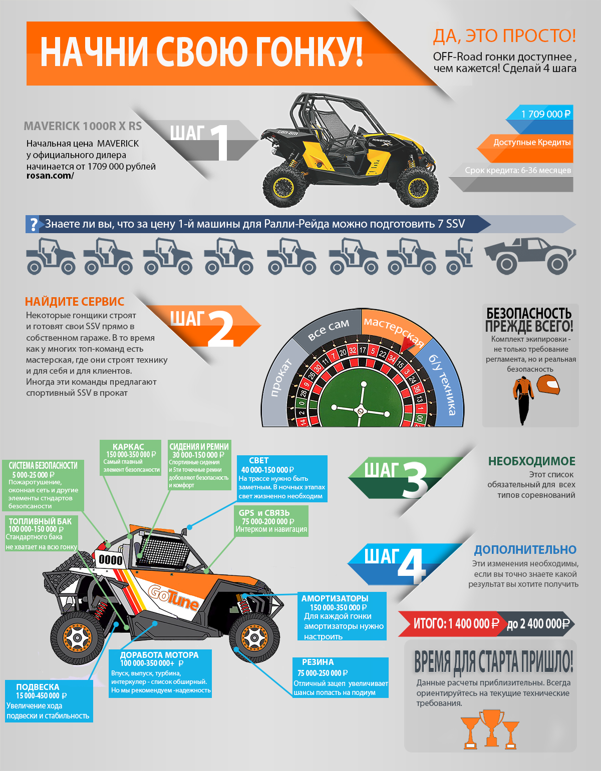 То, что гонки на SSV предлагают много возможностей, относится и к спонсорству. Есть множество компаний, которые по своим маркетинговым программам поддержки спорта будут поставлять вам запасные части со скидками, что сохранит вам тысячи долларов! У вас должен быть план, как вы собираетесь искать и привлекать спонсоров. Дни звонков и мейлов компаниям с предложением им наклеек на борту вашей гоночной машины за бесплатные продукты и услуги, давно прошли! Спонсоры хотят возврата вложений, они хотят заработать деньги на основе продуктов, скидок, в общем, денег, вложенных в вас. Наш первый совет - вы должны иметь план. Простое, легкое для чтения предложение спонсору гонки. Расскажите, кто вы, на чем и где вы ездите, как вы намерены продвигать этот бренд. Наклейка на боковой стороне машины - это самое простое и очевидное, но они хотят знать, где еще появится их логотип, насколько сильна ваша активность в социальных сетях, кто ваши другие спонсоры и как они работают с вами, тратите ли вы деньги на публикации фото и видео в СМИ, за счет которых они будут получать просмотры, и т.д.?
