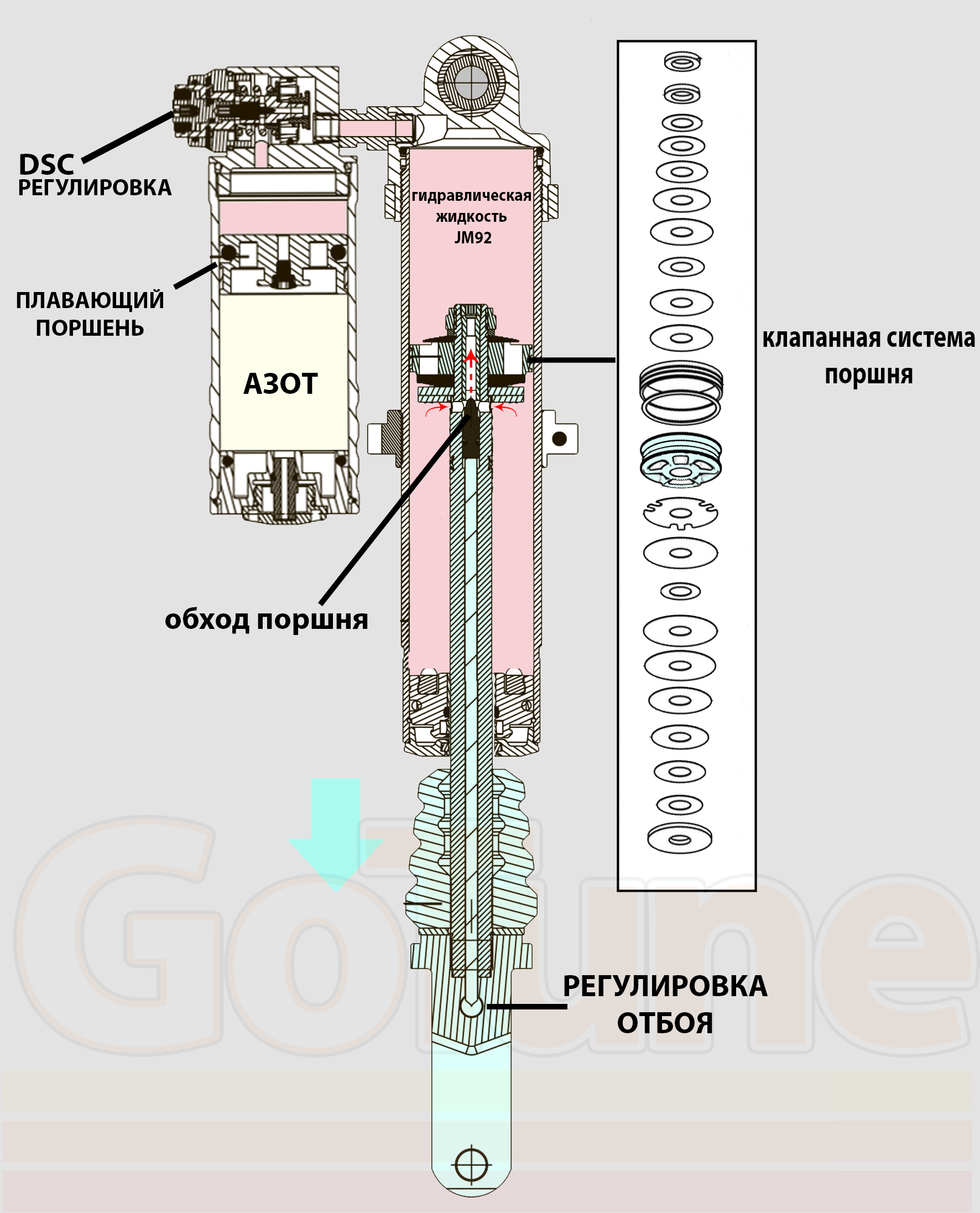 Механизм регулировки пропускает через себя поток масла, который возникает из-за того, что шток заходит в амортизатор и вытесняет объем масла равный объему зашедшего внутрь штока. Этот объем масла должен куда-то деваться. Он направляется из корпуса амортизатора в выносной баллон через систему регулировки сжатия. Будем называть ее DSC (у FOX она называется так Dual Speed Compression)