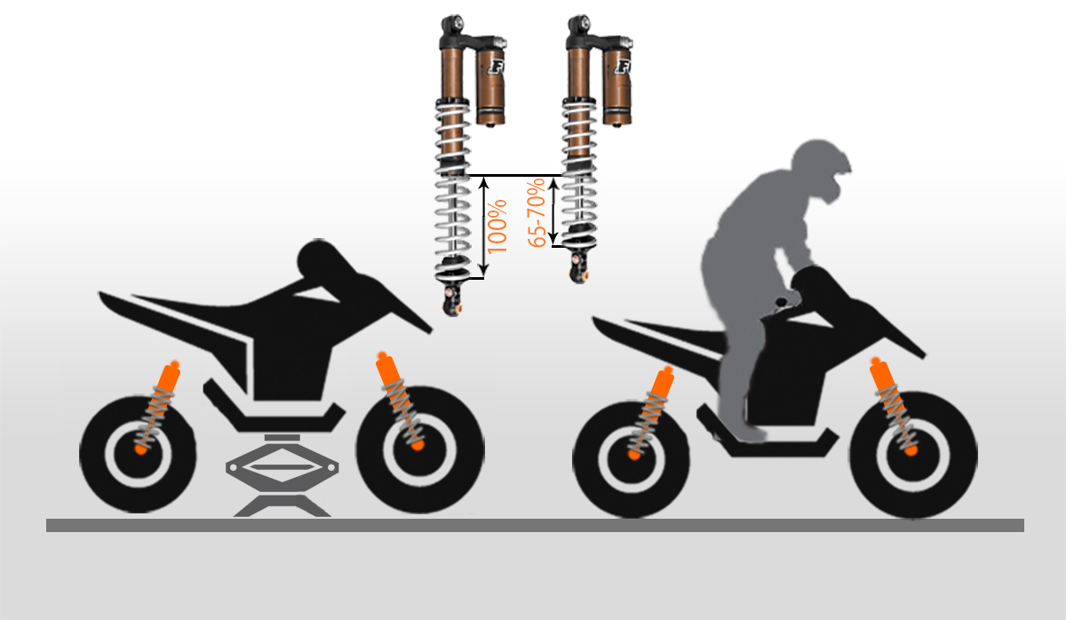 В большинстве случаев оптимальным для быстрой езды считается такое положение, когда на полностью снаряженной технике (включая тех, кто на ней будет ехать и всем грузом, что на ней обычно размещен, включая топливо) на ход сжатия оставлено 65%-70% от всего хода амортизатора. Это положение называется высота посадки.