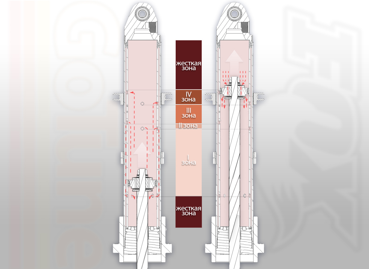 | Внутренний байпас, в отличие от привычного нам однотрубного амортизатора, имеет внутри корпуса байпасную трубу с обходными отверстиями, которые позволяют маслу перемещается в обход поршня. Количество байпасных отверстий и их расположение определяет, какое количество масла будет проходить в обход поршня при определенном его положении. Чем больше отверстий перед поршнем, тем большее количество масла проходит в обход поршня, и тем «мягче» работа амортизатора. По мере сжатия амортизатора поршень поочередно проходит байпасные отверстия. С прохождением каждого следующего байпасного отверстия количество масло свободно проходящего в обход поршня уменьшается, приводя к увеличению жесткости амортизатора. Минуя последнее байпасное отверстие, поршень начинает пропускать весь поток масла только через свою клапанную систему. Это самая жесткая зона, одна такая зона располагается в конце хода сжатия для исключения пробоев, а другая располагается в самом начале хода сжатия, когда амортизатор полностью разжат, для гашения начальной энергий при приземлении. Благодаря системе внутреннего байпаса, амортизатор получает прогрессивную характеристику с множеством зон жесткости, при этом обеспечивая мягкость работы и комфорт при небольших неровностях в середине своего хода, и обладает огромной энергоемкостью на больших неровностях. Аналогичная работа происходит при отбое - колесо имеет возможность максимально быстро двигаться вниз, не теряя контакта с дорогой, при этом обеспечивая поглощение энергии в крайних положениях штока амортизатора. |